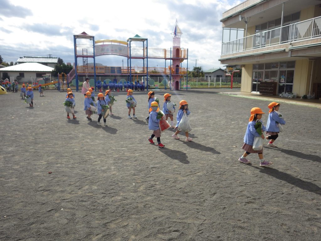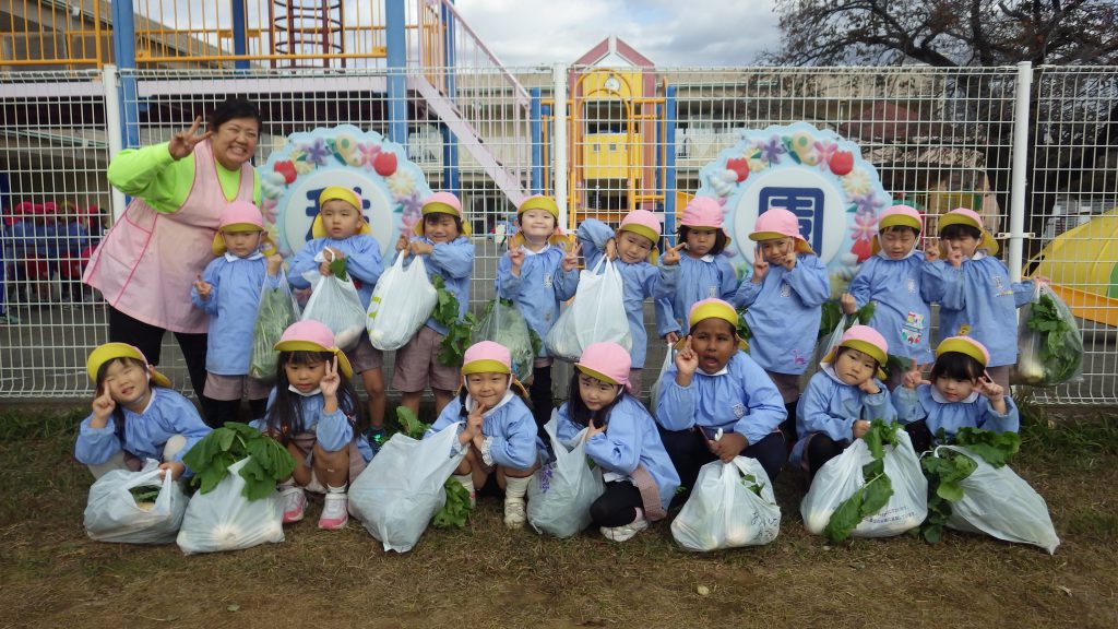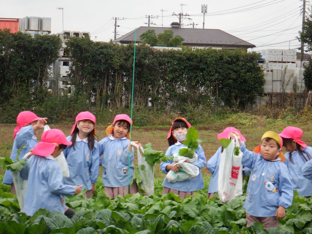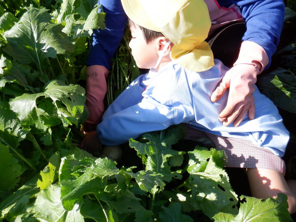 2025/11/13 大根とかぶの収穫💪 畑の大根とかぶを収穫しました😄 畑に着くと、一面の葉っぱを見て「どれとったらいいの?」とやる気満々の子どもたち✨ 力いっぱいに引っ張り上げ、出てきたかぶや大根に大喜びの様子でした! 「おもたすぎる・・・」と言いながらも一生懸命抱えて持ち帰る姿が印象的でした😊 お野菜をたくさん食べて、寒い冬も元気いっぱいに過ごしましょうね⛄