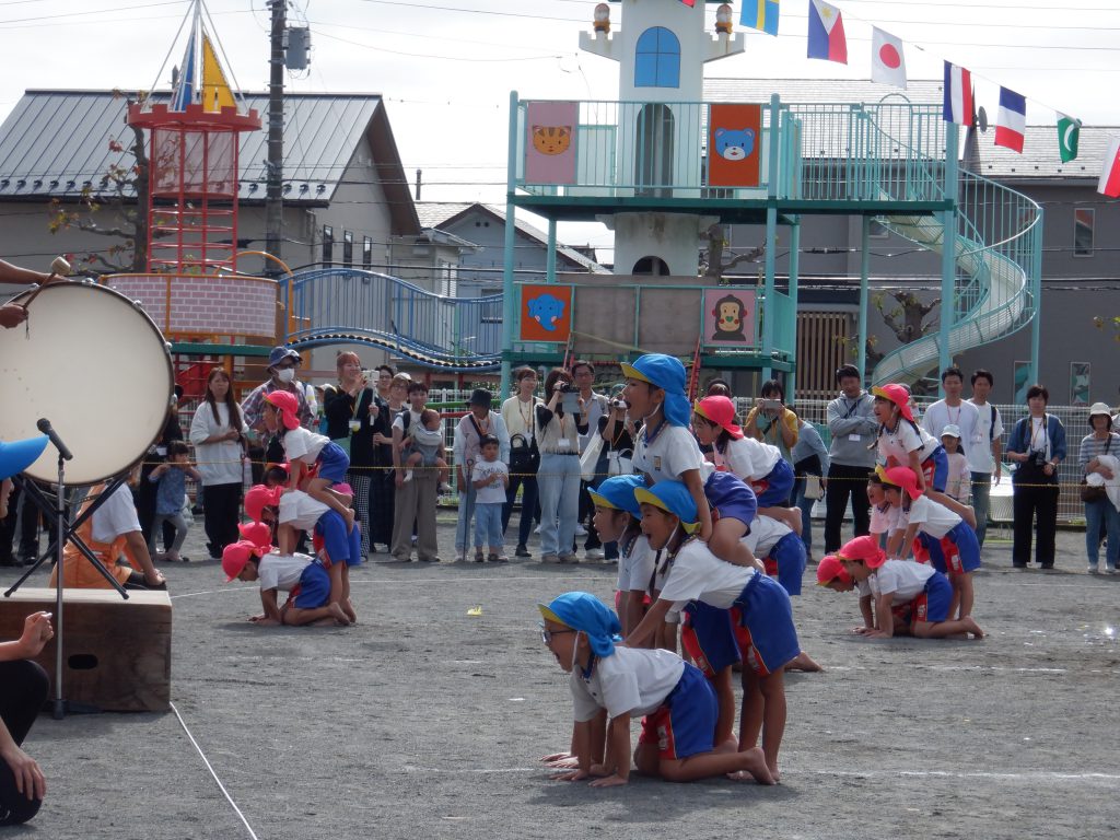講師の先生の合図に合わせて、演技した組体操。