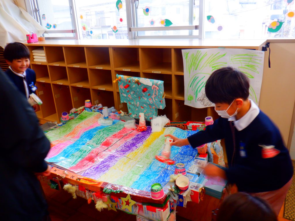 製作中の子どもたちは、お友だちや先生と相談しながら楽しそうに作っていたり、年中さんや年長さんは、飾りつけや置く場所にもこだわりがみられました。